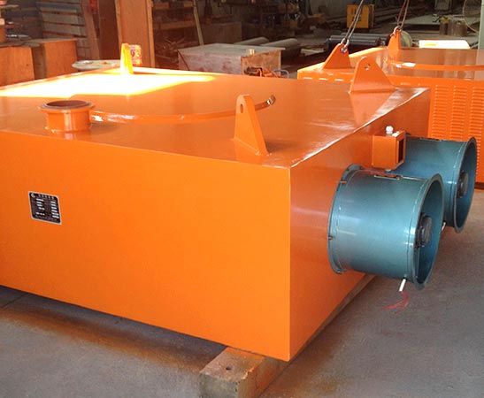 風(fēng)冷電磁除鐵器,采用空調(diào)或軸流風(fēng)機(jī)強(qiáng)迫風(fēng)冷,增加風(fēng)道,增大線路與空氣的接觸面積,改善風(fēng)冷效果。大型除鐵器采用軸流風(fēng)機(jī),風(fēng)壓高,風(fēng)量大,風(fēng)冷效果強(qiáng)。控制柜采用聯(lián)鎖機(jī)構(gòu),即風(fēng)機(jī)一停,除鐵器勵磁立即停電報警。