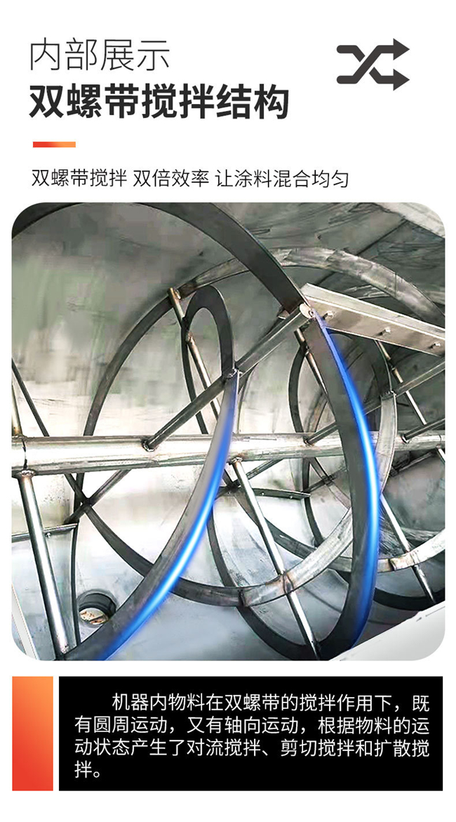 益膠泥混合機采用臥式螺帶混合機傳動主軸上布置雙層螺旋葉片,內部螺旋將物料向外側輸送,外部螺旋將物料向內部聚集。物料在雙層螺旋帶的對流運動下,形成一個低動力高效的混合環境。安裝于攪拌軸上的內外徑螺旋帶動桶體內物料,使攪拌器在桶體內最大范圍翻動物料。攪拌裝置工作時內螺旋帶動靠近軸心處物料做軸心旋轉,軸向由內至兩側推動,外螺旋帶動靠近桶壁物料做軸心旋轉,軸向由兩側至內推動,本混合物料能夠在較短時間內均勻混合。
